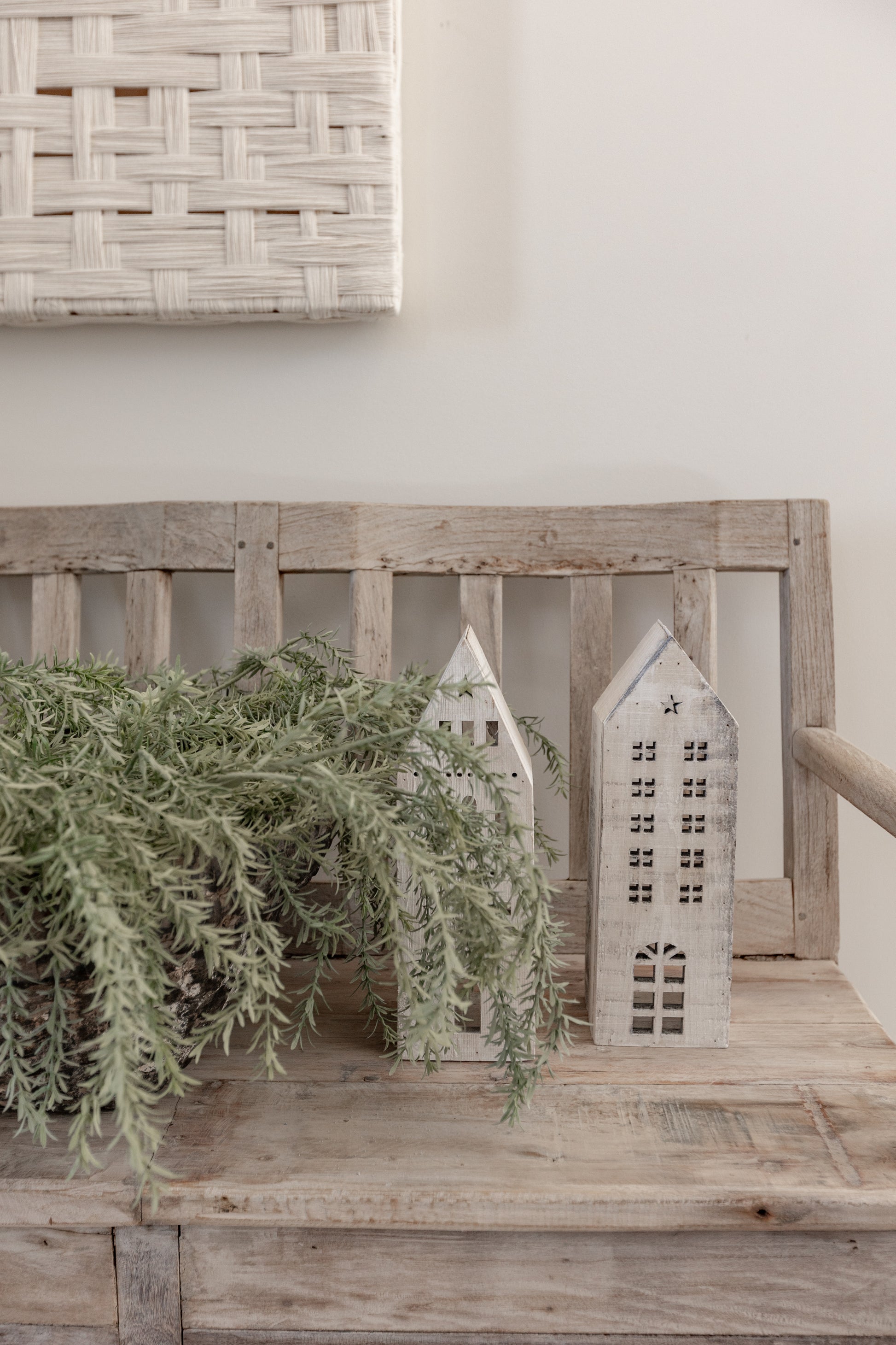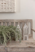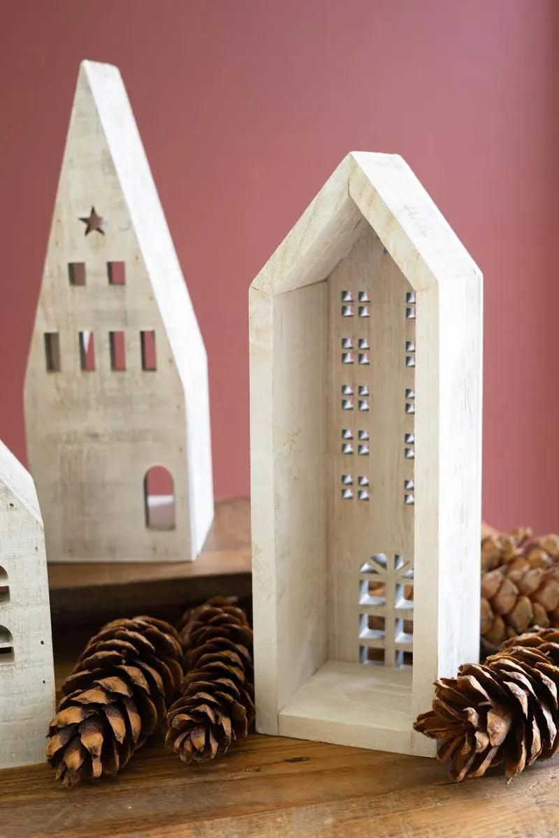 Bring home the warmth of a handcrafted holiday village with White-Washed Wooden Christmas Village. This charming five-piece set features beautifully carved wooden houses, each with unique windows and rooflines for an inviting, collected look. Whether styled on a mantel, console, or entryway table, it adds understated elegance and nostalgic spirit to your seasonal décor.